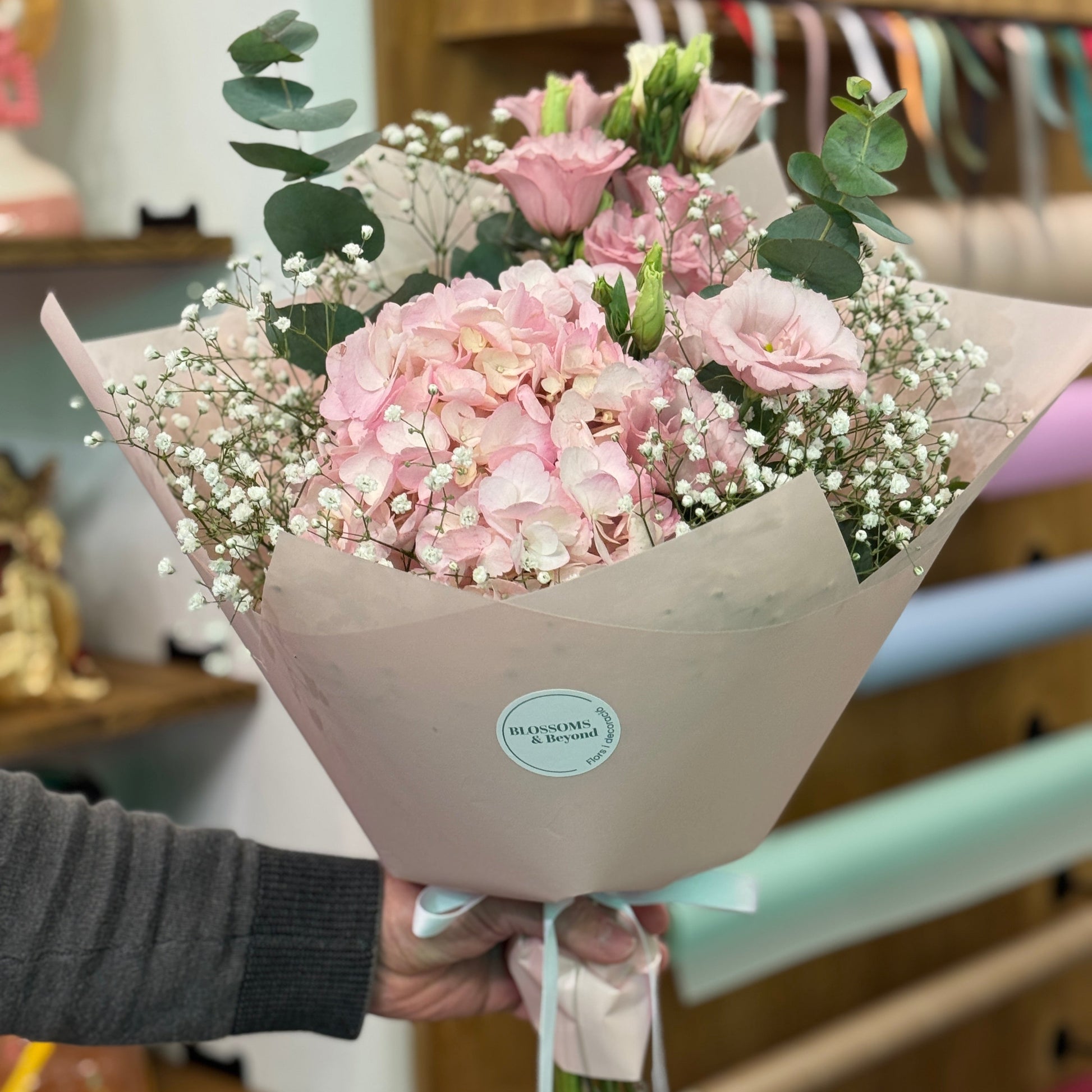 Un ram delicat que combina hortènsies, paniculata i lisianthus en tons rosa suau. Ideal per a ocasions especials, aquest arranjament aporta elegància i serenitat, omplint qualsevol espai de frescor, bellesa i sofisticació.