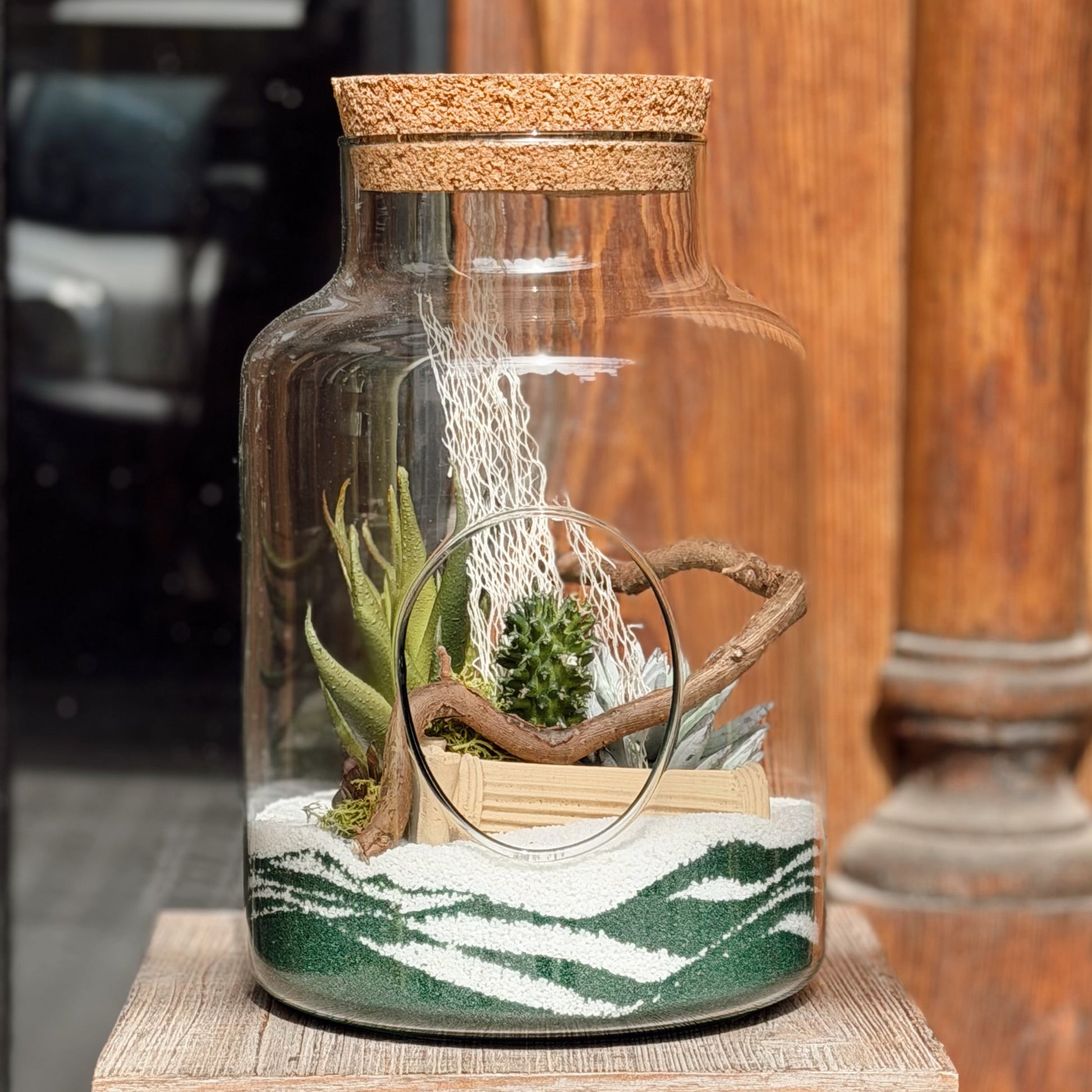 Diseñado para aquellos que disfrutan conectar con la naturaleza y llevar un pequeño jardín a su hogar, este terrario aporta frescura, elegancia y un toque verde a cualquier espacio.