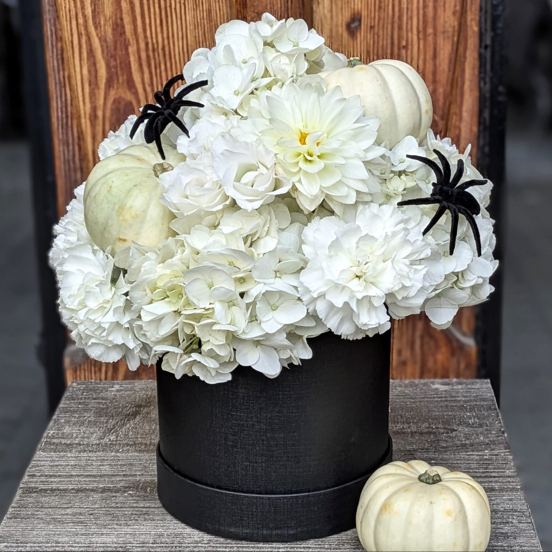 Su composición de flores blancas, pequeñas calabazas decorativas y detalles oscuros crea un contraste perfecto: delicado, moderno y con un aire misterioso ideal para la temporada de Halloween.