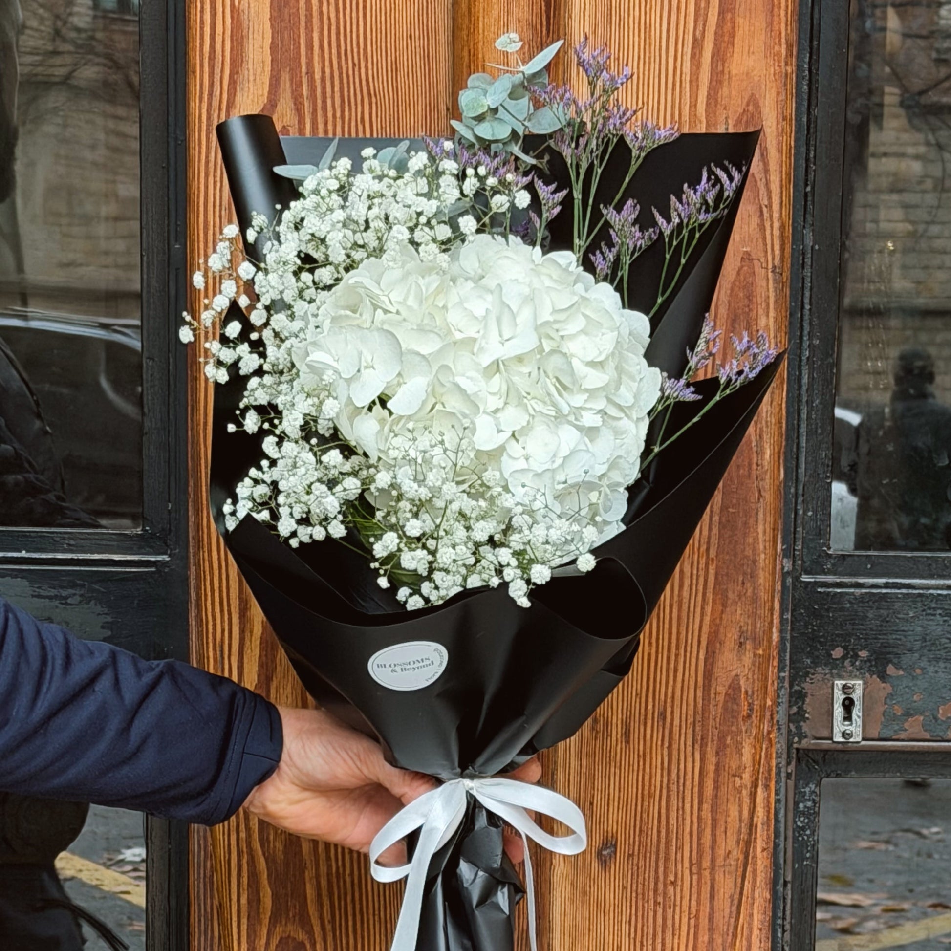 Ivory Silence es un ramo sofisticado y equilibrado, protagonizado por hortensia blanca, acompañada de paniculata, eucalipto y delicados toques florales que aportan textura y ligereza al conjunto. Todo envuelto en un acabado negro que realza el contraste y la pureza de los tonos.