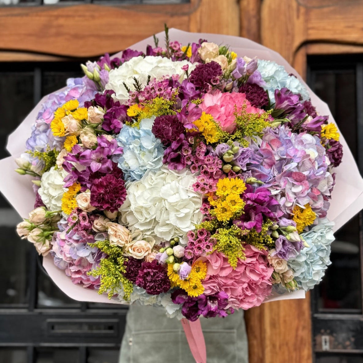 A burst of color designed for days that deserve to be celebrated in style. Lush Joy is a spacious and vibrant arrangement featuring hydrangeas, carnations, daisies, alstroemerias, and other flowers that combine harmoniously yet are full of character.