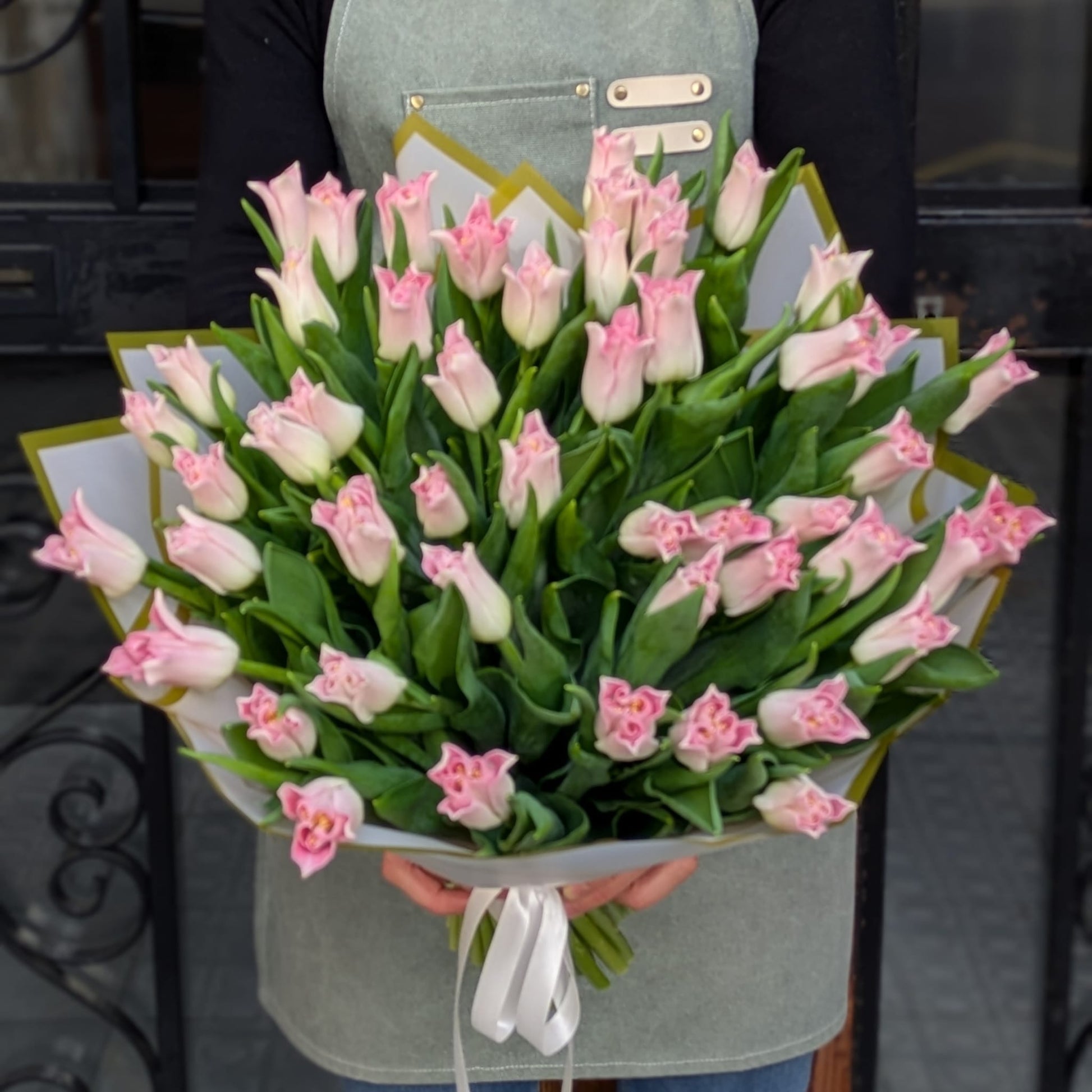 Descubre la belleza sublime de Spring Whisper, un opulento ramo diseñado para deslumbrar. Esta composición maestra agrupa 51 espectaculares tulipanes de color rosa pálido, cada uno con sus delicados pétalos con bordes ligeramente rizados que añaden una textura única y un encanto sofisticado.