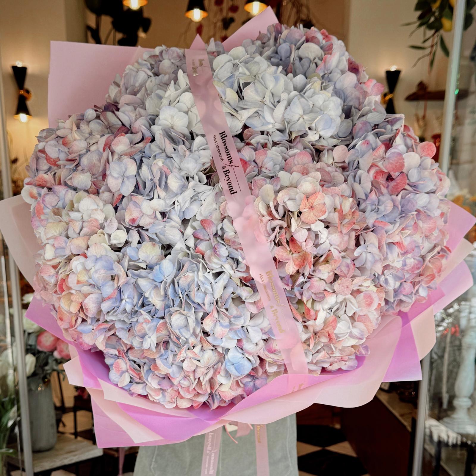 ¡Imagina la sorpresa en sus ojos al recibir el imponente ramo Blue Sky! Hortensias Jumbo en un azul celestial, tan grandes que parecen pintadas directamente del cielo. Este es un ramo para quienes no temen a lo extraordinario, un gesto tan impresionante que no necesita palabras.