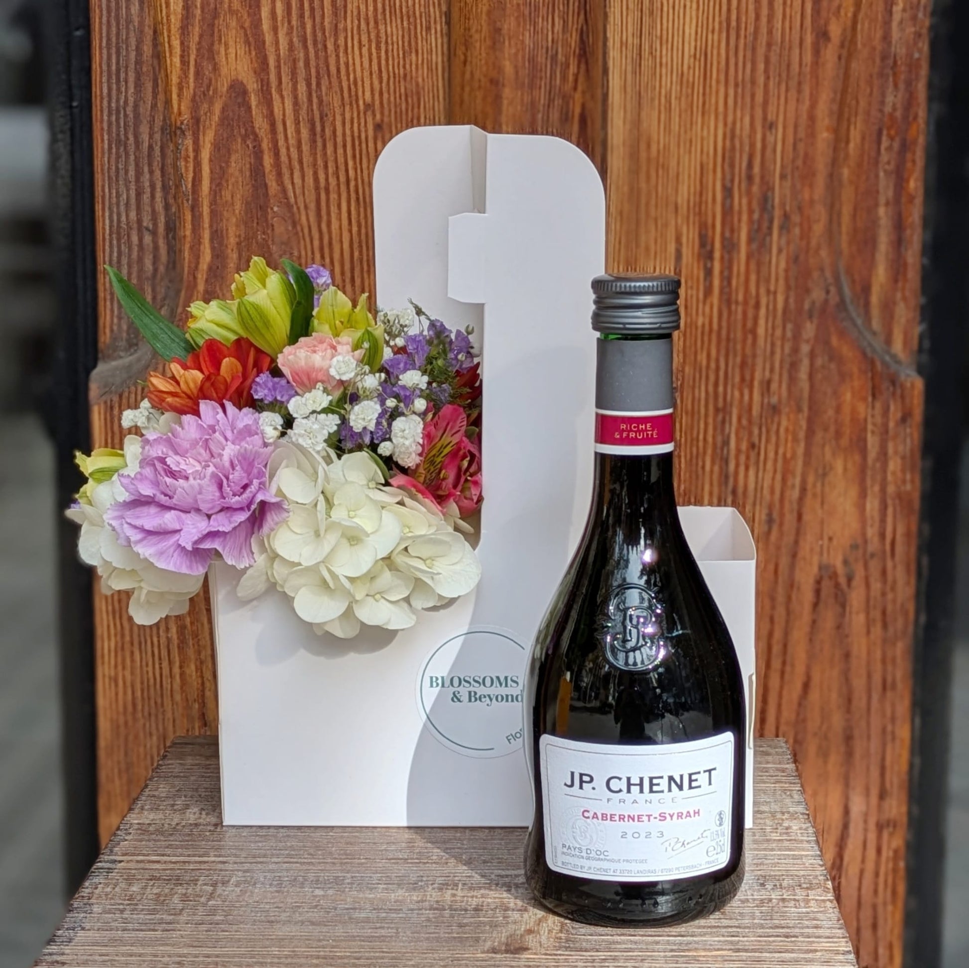 Este set presenta un vibrante y alegre ramillete de flores, y su acompañante ideal es una botella de J.P. Chenet Cabernet-Syrah 2023, un exquisito tinto francés con cuerpo, notas frutales de grosella negra y un toque especiado sutil.